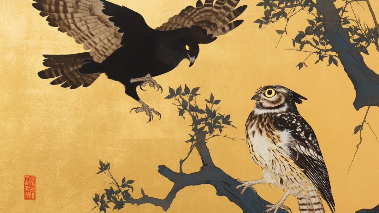 賢いフクロウが、知恵と忍耐の大切さを焦りがちなカラスに教える物語。